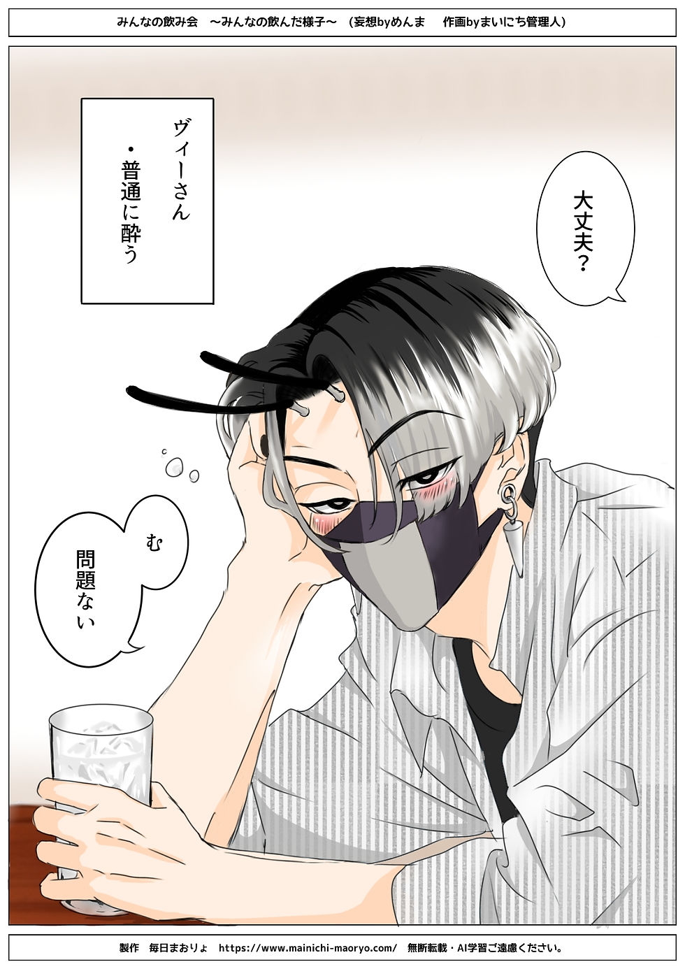 ヴィーさん…普通に酔う。深酒すると喋らなくなる。大丈夫?って聞くと「む…?問題ない」って返事してくれる。可愛い。